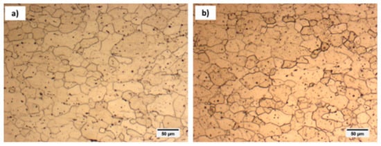 The optical microscopy (OM) metallographic analysis of AA6016 T4 sheets, observed in both longitudinal and transverse rolling directions, shows a homogeneous grain distribution without preferred orientation (Figure 4) as confirmed from other authors after solution heat treatment [20].