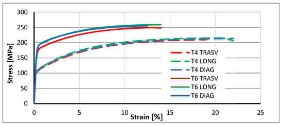 The static tensile tests, conducted on specimens both in the supplied T4 condition and in the simulated paint bake condition (T6 temper), always evidence a reduced scattering of the raw data with a substantial overlap of the curves obtained from repeated samples. In Figure 5, the curve of one representative sample is reported for every tested direction.
