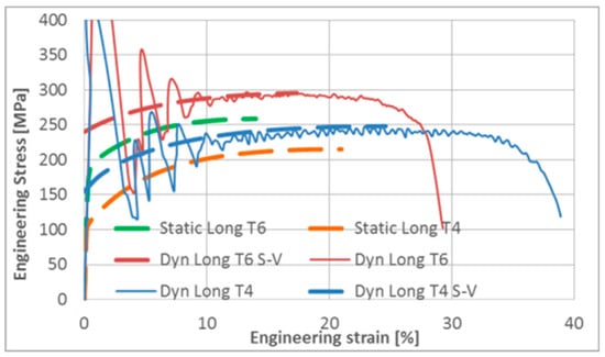 The dynamic tensile tests were performed on three samples for each of the three rolling directions in the T4 and T6 temper conditions. The raw data of the dynamic curves are generally characterized by marked oscillations in the elastic–plastic transition zone because the sudden applied load is not homogeneous along the specimen length and the deformation recorded by the strain gauge stations is often unstable [14]. Two representative engineering raw curves of samples taken in longitudinal rolling direction, for the T4 and T6 treatments, as obtained by the dynamic tests, are reported in Figure 6. At the beginning of the test, a spike followed by a sudden stress drop is usually recorded, and a final smoothed wavering trend is shown.