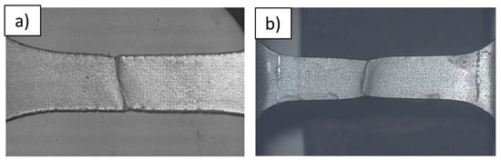 However, significant differences can be highlighted between them. The fracture surface of samples tested under static conditions shows dimples with the typical morphology resulting from microvoid growth and coalescence (Figure 8a). On the other hand, the fracture surface of the samples tested under dynamic conditions (Figure 8b) evidence the presence of microvoid growth in the area of maximum deformation of the neck, but these microvoids did not have the time to coalesce and form a crack propagating in the direction normal to that of maximum stress. This is evidenced by the presence of deformation porosities that develop even below the main fracture surface and are visible in Figure 8b.