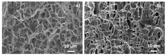 The fracture surfaces were observed by means of field emission scanning electron microscopy (FESEM SUPRA 40, Zeiss, Cohen, Germany) and show a ductile morphology characterized by micro-voids (or dimples, Figure 8) [30], which sometimes (images not reported) contain particles of second phases (mainly Si particles).