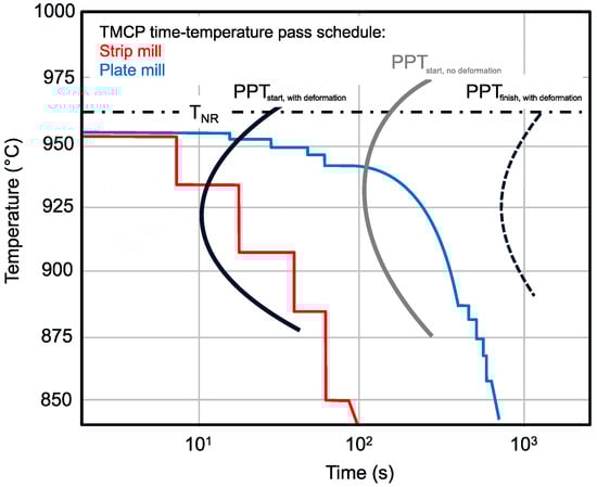 Schematic of rolling pass schedules in the thermo-mechanical controlled processing (TMCP) regime for strip and plate mills with respect to TNR (dashed line) and precipitation (PPT) kinetics.