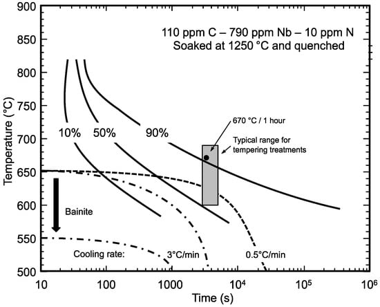 The niobium left in solute solution after rolling is available for precipitation during or after the phase transformation from austenite to ferrite. These NbC precipitates can nucleate as a consequence of partitioning and local supersaturation in the vicinity of the moving phase front, known as interphase precipitation [19,20]. Spontaneous precipitation after phase transformation can occur by nucleation on dislocations or by a mechanism of replacing iron by niobium atoms in previously formed nano-cementite particles as described by Hin et al. [21]. The kinetics of spontaneous niobium precipitation in ferrite is also relatively slow under typical finishing conditions for plate and strip products (Figure 2) [22]. It is apparent that even under hot finishing conditions, niobium precipitation will not be complete. Colder finishing conditions promoting bainite formation largely prevent niobium precipitation. Secondary heat treatment such as tempering, however, allows nearly complete precipitation [23].
