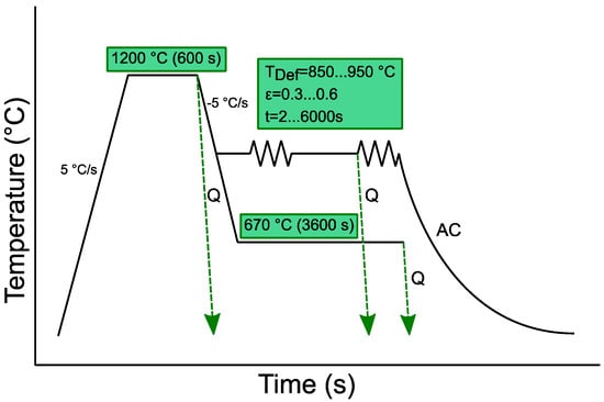 Schematic of the simulated heat treatments. Samples were characterized as-quenched (Q) from austenitization temperature or cooled down to deformation temperature TDef = 950, 900, and 850 °C with varying strain ε, holding times t, and quenching/second compression to measure the softening, and air cooling (AC). In addition, one sample was cooled down from austenitization temperature, aged at 670 °C for 1 h, and quenched afterwards.
