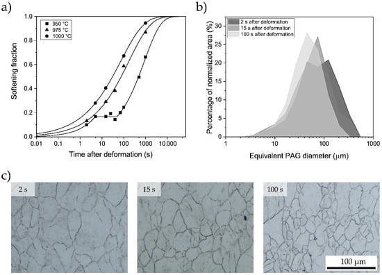 (a) Softening behavior of austenite after Gleeble double-hit deformation recorded for different deformation temperatures, (b) austenite grain size distribution as a function of the inter-pass time between two deformation hits derived from (c) light-optical metallography of the respective prior austenite microstructures after etching.