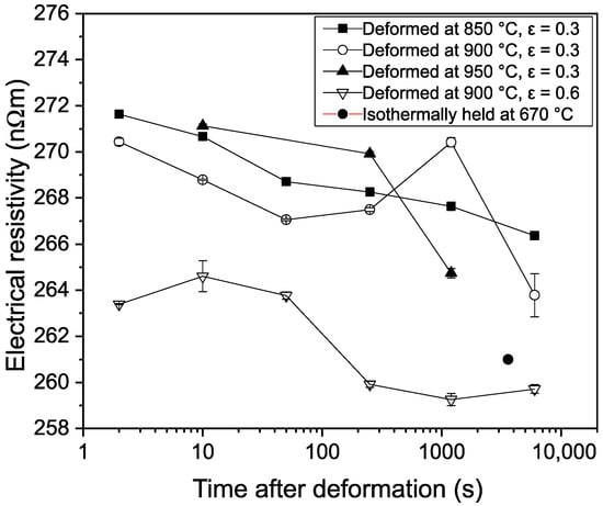 Evolution of electrical resistivity with the time after deformation for samples quenched from deformation at 850 °C, 900 °C, and 950 °C with ε = 0.3 and ε = 0.6 and after quenching from isothermal holding at 670 °C for 1 h.