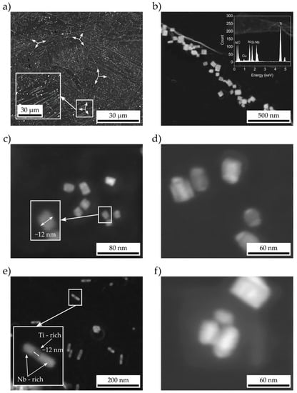 A more plausible explanation for the origin of the precipitate in Figure 9 is, that it had formed during the casting. If these precipitates did not (re-)dissolve during reheating, they would still be present in the samples quenched from a higher austenite deformation temperature after austenitizing at 1200 °C (Figure 6f), as well as in all other deformed samples. As it was shown for the Ti-containing small precipitates in the samples transformed isothermally into ferrite (Figure 11,d), titanium was still in solution at the austenite-to-ferrite transformation temperature. The bigger (Nb,Ti)(C,N) precipitates might therefore be the outcome of the coarsening of clusters such as displayed in Figure 11c. Preliminary work on the co-microalloying of niobium and titanium considered the higher temperature stability of (Nb,Ti)(C,N) precipitates to be the reason for their presence even after soaking at high austenite temperatures [5,7].