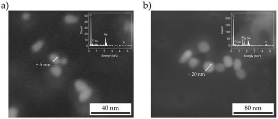 After applying deformation, the precipitate population observed by STEM was strongly augmented by a large amount of small precipitates which were homogeneously distributed inside the grains. Figure 7 shows their size and distribution exemplarily on the sample deformed at 950 °C with a strain of ε = 0.3. The size of precipitates is in the range of 5 to 20 nm depending on the holding period after the compression hit, which was 200 and 1200 s, respectively. EDS shows that the precipitates are free or nearly free of titanium even after prolonged holding times.