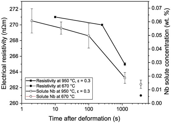 The electrical resistivity behavior as a function of the time elapsed after deformation is shown in Figure 5 for the temperatures 850, 900, and 950 °C. For all temperatures, there was an almost steady decrease of resistivity after deformation which slowed over time (note the logarithmic time axis). Directly after the deformation, the resistivity was around 272 and 270 nΩm for samples deformed at 850 and 900 °C, respectively, and decreased to 266 and 264 nΩm after 6000 s. The resistivity of the samples deformed at 900 °C was mostly lower than that for 850 °C, having an offset of roughly 1 nΩm. For 950 °C, after 1200 s, the resistivity dropped below the respective values of 850 °C and 900 °C after being larger for shorter holding times. The resistivity of the sample deformed at 900 °C and held for 1200 s increased compared to other values and was reproduced in many different measurements. When the deformation was increased to ε = 0.6, compared to ε = 0.3, the resistivity was lower even for short holding times, and then dropped finally to resistivity values of roughly 259 nΩm. Just above this value, with 261 nΩm, lay the electrical resistivity of the sample that was isothermally held at 670 °C for 1 h.