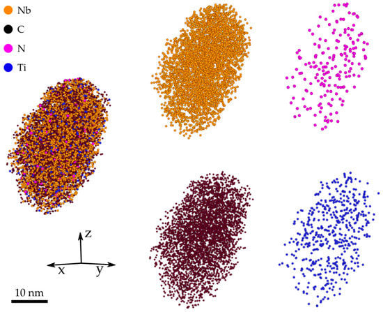 APT analysis of a bean-shaped particle similar to those in Figure 6f, but measured in the sample deformed at a lower austenite temperature and higher strain (850 °C, ε = 0.6), and quenched after holding for 200 s. Niobium, carbon, titanium, and nitrogen atoms are displayed.