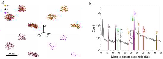 As shown before, after applying strain, the precipitate population observed by STEM was strongly expanded by a large number of small particles (Figure 7). In the sample deformed with a higher strain of ε = 0.6 at 850 °C, APT could detect small precipitates which are represented in Figure 10a. Table 4 shows that carbon and niobium were indeed the dominant elements in these precipitates, while only a small fraction of nitrogen and practically no titanium was found. The APT mass spectra peaks of 12C2+ and 12C+/12C22+ both contained significantly more atoms than the combined niobium atoms in the respective peaks at 23.3 Da (93Nb4+), 30.9 Da (93Nb3+), 46.5 Da (93Nb2+), and the (93Nb14N)3+ (Figure 10b). The peak at 24 Da corresponded either to carbon or titanium. Since no Ti2+ isotopes at 23, 23.5, 24.5, and 25 Da were present, the peak at 24 Da was assigned to 12C2+. Although it is not possible to assure that all the counts at this peak correspond unambiguously to carbon, these counts represent only 5% of the particle composition. Adding up all carbon counts, the Nb/C ratio was only 1.2:2. Yet, if the nitrogen counts are considered as well, the ratio of niobium to interstitial atoms approaches 1:2. Consequently, the chemistry of the precipitates was considered to be sub-stoichiometric (Table 4).