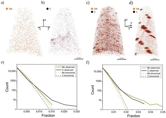 In samples deformed at 950 °C and quenched after short holding times up to 1200 s, carbon clusters were observed as shown in Figure 11b, whereas for niobium, the atom map (Figure 11a) indicated no obvious clustering in any of the cases (for ten or more measurements for each holding time 2, 15, 100, and 1200 s, analogous to the APT analysis shown in Figure 8). To rule out early stages of clustering, the distribution of the carbon and niobium atoms in the APT reconstructions was compared to a random distribution (frequency distribution analysis in IVAS software, binning 200 ions; Figure 11e). It can be seen that in the particular case of the atom maps of Figure 11a,b, only carbon was exhibiting a small deviation of 0.5 to 1 at. % from random distribution for a small number of clusters (Figure 11b), while niobium appeared to be randomly distributed throughout the volume (Figure 11a). No precipitates as detected in STEM (Figure 7) were detected by APT.