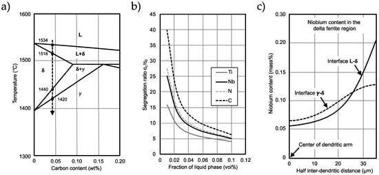 (a) Solidification scenario in the delta-ferrite range of the binary Fe-C diagram (equilibrium transformation temperatures for carbon content of 0.04 wt. %); (b) calculated segregation ratios as function of the residual liquid share; (c) homogenization of unequal niobium distribution after solidification by fast diffusion in delta-ferrite as a function of the secondary dendrite arm spacing.