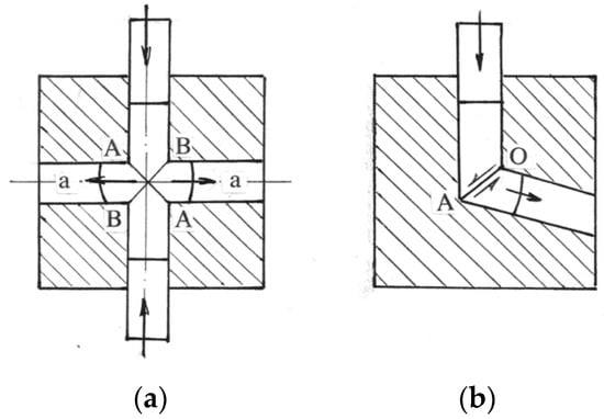 Bridgman’s works demonstrated that material processing by intensive shear resulted in strong, and sometimes, unusual effects on structure and properties. The most perfect realization of this concept is simple shear deformation during plane plastic flow. Neglecting, as usual, the elastic strains and material hardening during SPD, a well-developed model of an ideal plastic material and the slip-line theory can be used for correct analysis of the processing mechanics as a function of the boundary conditions and tool geometry. This approach was first applied in 1970 for the synthesis of simple shear processing along two crossing slip lines AA and BB of a velocity discontinuity in “cross-extrusion” (Figure 1a) [3]. “Cross-extrusion” produces intensive mirror-like symmetric shears relative to the material mid-thickness a-a, but it cannot be considered to be an industrial operation. The same principle was further realized (1972) in equal-channel angular extrusion (ECAE) by simple shear along a single slip-line AO (Figure 1b). For steady and frictionless ECAE, simple shear along the straight slip-line AO is uniform, strictly oriented, and intensive depending on the intersection angle between channels. This “ideal” case is optimal for SPD processing. In real situations, there are additional conditions providing close approximation to the “ideal” case. They relate to the contact friction, tool design, angle of intersection between channels, and back pressure in the outlet channel.