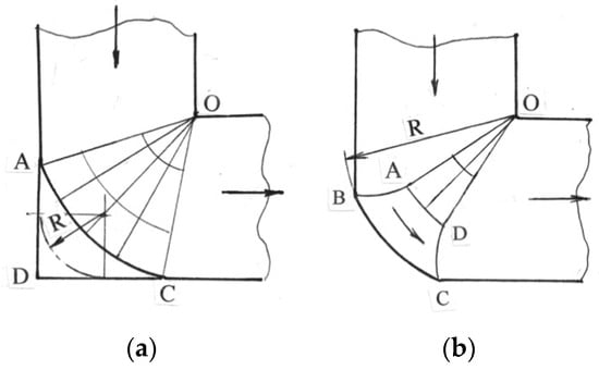 Despite the use of the best lubricants, some friction is always present during ECAE. The necessity to fulfill friction boundary conditions changes the plastic zone from the single slip-line AO (Figure 1a) to a central fan AOC (Figure 2a), the angle of which increases with the increase of friction. Figure 2a shows the slip-line field for equal friction in both channels [3,18]. The central fan AOC redistributes shears between three different directions and forms a “dead” metal zone ACD [3].
