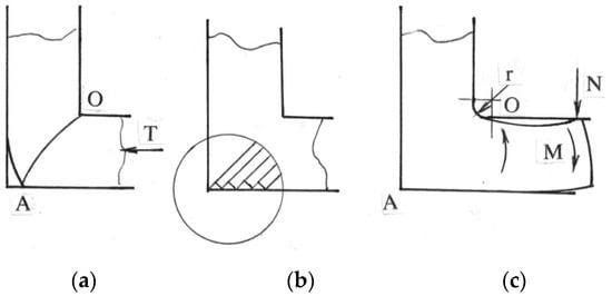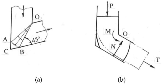 - The tendency for material rotation after crossing the shear plane (Figure 4c) is balanced by a reactive moment M in the outlet channel. This moment re-bends the material and develops tensile stresses in the vicinity of the channel corner O that leads to ductile fracture at the top billet surface. A small radius r of the inside channel corner removes a stress singularity around the sharp corner O, modifies stresses in this region from tensile to compression, and eliminates surface cracks [20].