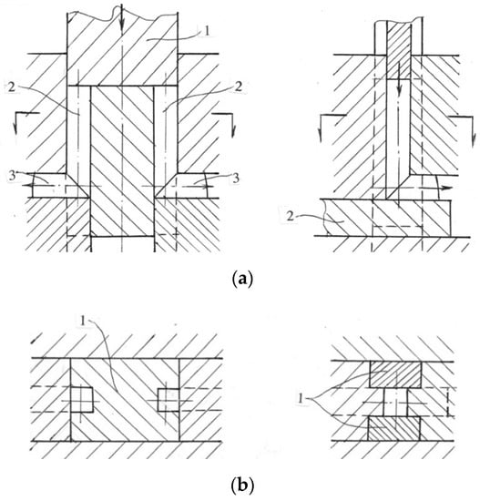 These problems were resolved by the application of a movable slider (1) between two inlet (2) and outlet (3) channels (Figure 5a) and by using an effective graphite-liquid glass lubricant. This design is eliminated friction along three channel walls, provided punch strength and stability, balanced the slider, and delivered lubricant to the bottom walls of the outlet channels. After reaching the lowest position, the slider retreated and released the billets, which could be withdrawn from the outlet channels.