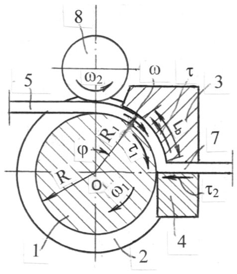 There is significant interest in Conform–ECAE (C-ECAE) of long products, which are usually fabricated by rolling, drawing, or extrusion. The C-ECAE was first developed by the author in 1976 in Minsk, FTI, USSR [24]. The biggest problems present process instability, surface finish, and tool wear. In the ordinary Conform-extrusion, a length of the contact area between the material and tool is fixed. The material is first heated and, then, extruded by friction forces. Therefore, the stabilizing factor is a deviation in the extrusion temperature. For C-ECAE, intensive heating is not allowed. Slippage between materials and a roll and the increase of the processing temperature depend on the contact length. They are insignificant for the optimal length and increases with the increase of the length over the optimal value. For a length shorter than optimal, material skidding with intensive heating are observed [19]. The two later cases lead to overheating, tool wear, and interrupted processing. In the first design of C-ECAE [24], the contact length was adjustable by changing an eccentricity between the roll and ECAE tool. Nevertheless, extrusion was faltering because of variations in friction and processing conditions. The more advanced design of Figure 7 [19] provides a self-adjustment owing to the automatic change of the contact billet length Lb during processing.