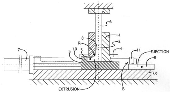 A new concept of semi-continuous “pass-by-pass” ECAE without any additional operations was recently developed by Engineered Performance Materials (EPM) [25]. The schematic shown in Figure 8 illustrates the principle and tool design. The inlet channel 2 and the outlet channel 3 are formed by a tool block 1 and slider 5 mounted at a base plate 9. The slider has a protrusion 10 overlapping the outlet channel. In the original position, the billet 8 is inserted in the channel 2 and a hydraulic cylinder 7 moves the slider on the right till a tight contact is achieved between the billet and protrusion 10. During billet extrusion by a punch 6, the billet and slider in the outlet channel are moved with the same speed eliminating friction at the bottom billet surface and transforming friction between slider 5 and guide plate 9 in a back pressure. After completion of the stroke, the cylinder moves the slider to the limit left position, fully releases the billet, and the punch 6 pushes the billet onto the base plate. Then, the cylinder 7 returns the slider to the original position, ejects the billet from the die, and simultaneously cut off flashes at the top billet surface by a knife 11. As the billet in the outlet channel is fully constrained, it can be immediately lubricated and inserted into the inlet channel for the next pass.