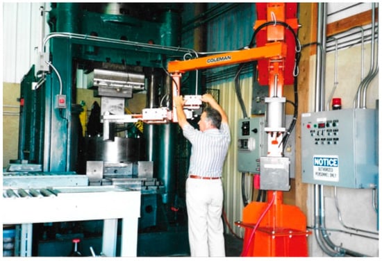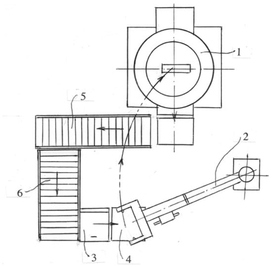 Figure 10 demonstrates the billet loading into the die channel by the manipulator. After billet extrusion and ejection on the conveyor 5, the punch and slider are returned to the original positions to perform the next stroke. The extruded billet is delivered by the conveyors 5, 6 to the band saw. The second operator rotates the billet 90°, pushes it through the band saw to provide the correct size, and advances to the lubrication station. Such processing is repeated for each billet the required number of passes “N”. After the total number of press strokes “n × N”, processing is interrupted, billets are unloaded from the conveyor, and the next group of “n” billets are loaded in the line.