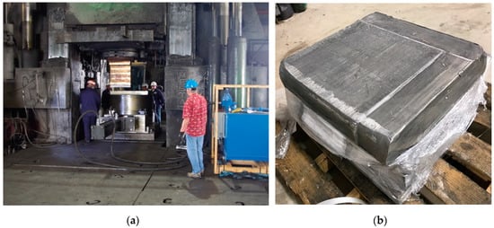 The first large-scale die for sc-ECAE was designed, fabricated and tested in the production environment for plate billets of the size 610 mm × 610 mm × 100 mm and a weight of 100 kg (for aluminum alloys). The die was mounted and fixed on the 11,000-t hydraulic press at Ellwood Texas Forge (ETFH, Houston) (Figure 12a). All works were performed by the EPM, Army Research Laboratory and ETFH forging crew. In accordance with previous results on the small-scale die (150 mm × 150 mm × 30 mm) [27], extrusion experiments were carried out for aluminum alloy 5083 and magnesium alloy AZ31 at the temperatures 250 °C and 275 °C, respectively. The die temperature was 200 °C. The alloys were processed semi-continuously for 4 passes for AA5083 and for 2 passes for AZ31 without any defects. Figure 12b shows the appearance of the AA5083 billet after processing. The die and related systems worked properly and confirmed their potentials for industrial applications. However, the processing time was too long ranging from 4 to 6 min per pass, because a large production manipulator was not suitable for billet handling and precision work with ECAE die, and because billet rotation and lubrication were performed manually.
