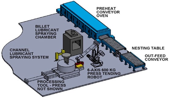 The production experiments demonstrated that the increase of productivity and reduction of cost require automatization of material handling and auxiliary operations. A concept of a robotic automation line for ECAE of large plate billets developed by EPM is presented in Figure 13 (a computer graphic by H. Haidalionik). Original billets are loaded in a conveyor oven. After heating to the required temperature, billets are periodically transferred to a feeding conveyor and delivered to a nesting table into a fixed position. A robot clamps the billet, places it in a spray lubrication chamber, and inserts it into the ECAE die mounted at a press (not shown here). Before each stroke, the die channel is lubricated by the die spray lubrication system. After completion of the ECAE pass, the billet is ejected from the die. For multi-pass processing, it is important that the semi-continuous ECAE die (Figure 11a) secures the billet location and orientation after ejection. The robot clamps the billet, rotates it into the prescribed direction, delivers to the lubrication chamber, and inserts again in the die for the next pass. Such operations are repeated for the required number of passes. Finally, the robot places the billet on the out-feed conveyor, and the next billet is transferred from the oven to the feeding conveyor.