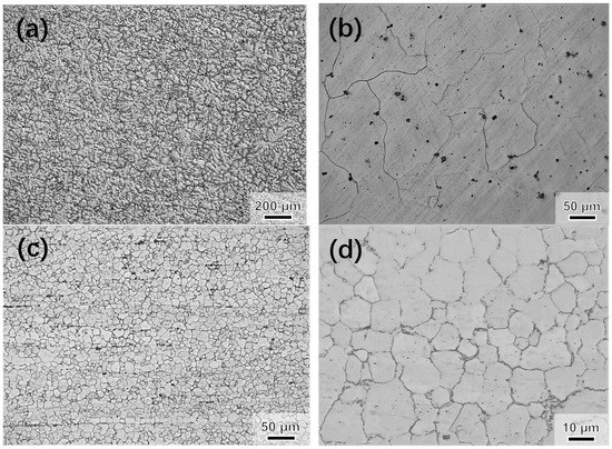 Optical microscope (OM) images of (a) the as-cast, (b) as-homogenized, and (c,d) as-extruded AZ80 alloy.