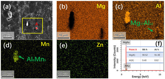 (a) Scanning electron microscopy (SEM) microstructure of as-extruded AZ80 alloy; (b–e) energy dispersive spectrometer (EDS) mapping images of (b) Mg, (c) Al, (d) Mn, and (e) Zn, respectively; (f) EDS data of the particle A in (a) indicating that the marked phase is Mg17Al12.