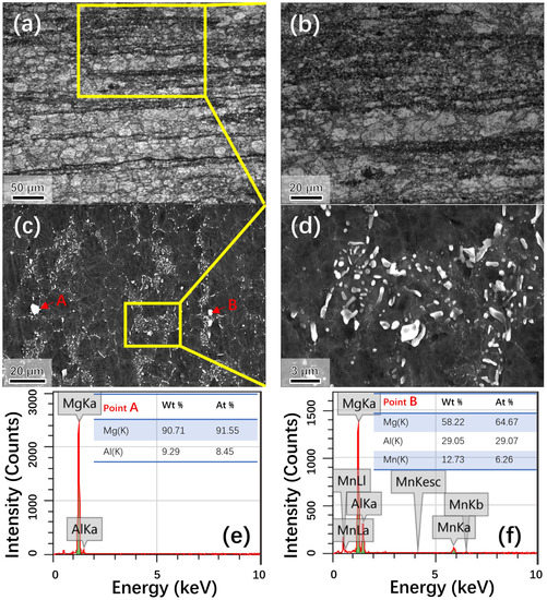 Figure 5 indicates OM, SEM and EDS results of the caliber rolled AZ80 alloy. Different from the homogeneous microstructure of the as-extruded sample, the CRed sample exhibits a typical bimodal microstructure consisting of deformed grains original from as-extruded state and much finer grains formed around the deformed grains. This necklace bimodal microstructure of CRed AZ80 alloy indicates that DRX occurred during the 3 pass caliber rolling at 300 °C, which is commonly observed during multiple pass caliber rolling of AZ31 [24]. The second phases are more clearly observed in the SEM images, as shown in Figure 5c,d, both micro-scale and nano-scale second phase particles were detected. Furthermore, EDS results (Figure 5e,f) confirm that the micro-scale second phases include both Mg-Al and Al-Mn phases, which can be identified as Mg17Al12 and Al8Mn5, respectively. The Mg element was also detected in particle B, which is from the matrix where the Al8Mn5 phase particles distributed on.