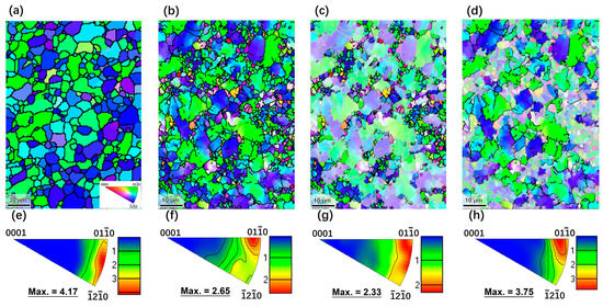 (a–d) Inverse pole figure (IPF) maps and (e–h) IPFs of (a,e) as-extruded and (b–d,f–h) CRed AZ80 alloy, respectively; (b,f) overall; (c,g) DRXed; (d,h) unDRXed regions of CRed AZ80 alloy.