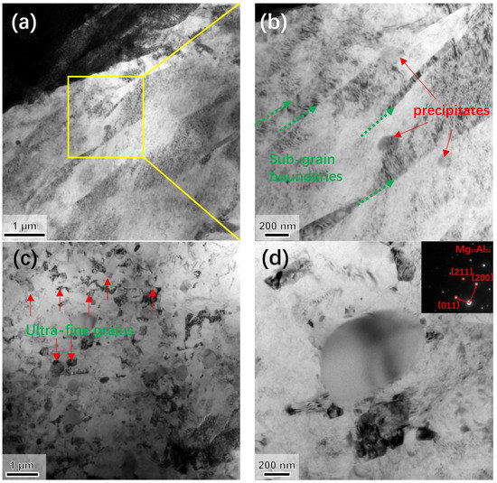A TEM experiment were also carried out to further reveal the bimodal microstructure and the precipitation behavior of the CRed sample. Bright field TEM images of the CRed AZ80 alloy are displayed in Figure 7. As exhibited in Figure 7a,b, lots of sub-grains can be detected in the deformed matrix, indicated by the green arrows. It is thus hypothetical that these sub-grain boundaries can also play a role in generating the potential nuclei of recrystallization. Besides, as indicated by the red arrows in Figure 7b, nano precipitates are found to be distributed near these sub-grain boundaries. In addition, the typical TEM image of the ultra-fine microstructure in CRed AZ80 is presented in Figure 7c,d. The DRXed grains that formed during caliber rolling have the grain size of ~0.85 μm. Nano precipitates were also detected in the matrix of ultra-fine grains area (Figure 7d). Based on the indexed result of the selected area electron diffraction pattern, these nano-scale precipitation particles are confirmed as Mg17Al12 (bcc, a = b = c = 1.056 nm). These spherical Mg17Al12 particles are mainly formed during extrusion as a result of dynamic precipitation [23]. During caliber rolling at 300 °C, these pre-existing phases are believed to restrict the grain growth of the DRXed grains after nucleation by pinning effect, which will contribute to the formation of ultra-fine DRXed grain structure [25,26,27]. Surprisingly, the ultra-fine grain size of AZ80 alloy (~0.85 μm), which is effectively pined by nano-precipitates during caliber rolling, is even finer than that of 18 pass caliber rolled AZ31 (1.5 μm) [17]. Furthermore, the ultra-fine grain structure is even comparable with that obtained by double extruded Mg-Ca alloy (~0.7 μm) [11], and the ultra-high strength Mg-2Sn-2Ca (TX22) alloy (~0.65 μm) extruded at low temperature (200–240 °C) [28]. Accordingly, the submicron grain size, nano precipitates in present CRed AZ80 alloy can necessarily contribute to good mechanical performance. Based on the above EBSD and TEM results, it can be concluded that the bimodal microstructure of CRed AZ80 sample can be mainly owing to the DDRX that mainly occurred along the grain boundaries of the as-extruded sample during rolling process. Furthermore, the abundant precipitation of nano Mg17Al12 particles greatly contributes to the formation of the ultra-fine grains in the necklace structure by pinning effect.