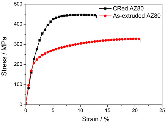 Typical tensile stress-strain curves of CRed AZ80 alloy compared with as-extruded AZ80 sample.