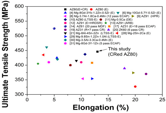 Comparison of UTS vs. EL of CRed AZ80 with previously reported wrought Mg Alloys [4,6,8,9,10,11,12,13,14,17,19,21,28,29,30,31] (E: Extrusion; CR: Calibre rolling; ECAP: Equal channel angular pressing; HPR: Hard plate rolling; LTSS-E: low temperature slow speed extrusion; DE: Double extrusion; HRDSR: High-ratio differential speed rolling; ARB: Accumulative roll bonding; R: Rolling; MDF: Multi-directional forging).