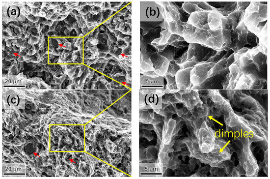 On the other hand, the CRed AZ80 sample demonstrates a lower EL (13%) than that of the as-extruded sample (20%). This can be explained by the evidence observed on the fracture surface after tensile test, as shown in Figure 10. Both the as-extruded and CRed AZ80 samples demonstrate ductile characteristic with plenty of dimples on the surface. In addition, micro-scale second phase particles can be observed in fracture surface of the two sample (Figure 10a,c), which is constant with the above microstructure characterization results. However, the surface morphology of the as-extruded sample is more uniform than that of the CRed one, owing to the homogenized and bimodal microstructure of as-extruded and CRed samples, respectively. Besides, the dimples in the CRed sample there are much smaller and shallower than those of the as-extruded sample, as compared in Figure 10b,d. As the strain hardening ability of ultra-fine grain area is lower than that of the micro-scale grain area [23], the inhomogeneous deformation between ultra-fine grains and microscale deformed grains in CRed sample will cause the initiation of fracture, thus decrease the ductility of the CRed AZ80 alloy.