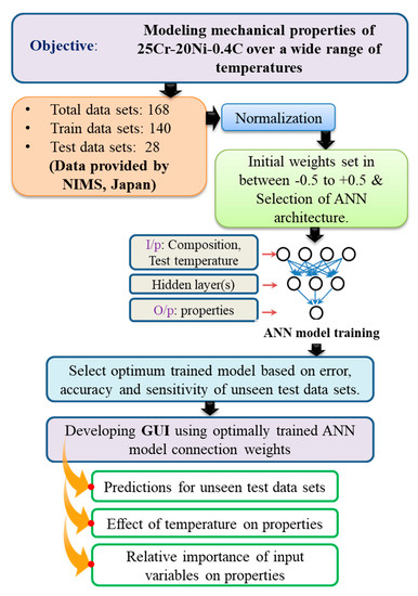 In this regard, the use of computational tools has been increased to understand the complex input–output variable relationships to solve materials science applications [8]. Especially in the case of austenitic stainless steels, various computational tools have been used for modeling of creep strength as well as rupture life [9], creep life [10] and thermomechanical process optimization [11]. Regarding the creep strength and rupture life reported in [9], the authors used various grades of austenitic stainless steels and the neural network model was able to perceive the interactions between the different input variables (composition, test temperature, rupture life and solution treatment temperature). Y. cui et al. [10] proposed the Riedel models for modeling the long term creep damage of various batches of austenitic stainless steels (316LN) as a function of stress, temperature and time. The developed model was able to predict the creep lifetime of steels for longer times with sufficient accuracy. Further, the relationship between the thermomechanical processing parameters (strain level, annealing temperature and time) with the fraction of the low-∑ coincident site lattice (CSL) boundaries of 304 austenitic stainless steels has been modeled using backpropagation neural networks [11]. By optimizing the thermomechanical process parameters, the authors can attain the maximum fraction of low-∑ CSL boundaries, which help to enhance the intergranular properties of materials [11]. However, to the best of the author’s knowledge, there are no relevant reports regarding the modeling of mechanical properties as a function of composition and exposure temperature of 25Cr-20Ni-0.4C austenitic stainless steels. Is has been well reported that the method using neural networks holds significant importance due to its high accuracy in correlating the complex-related input and output variables, as compared with the other regression as well as the mathematical models [12,13]. In principle, the neural networks can learn from training data and generalize overall trends in functional relationships between inputs and output parameters. Although several network architectures and training algorithms are available, the feed-forward neural network with the back-propagation learning algorithm is more commonly used [14]. Therefore, in the present work, we focused on the development of a feed-forward ANN model to predict the properties for a given composition and exposure temperature, and the relationship of the properties with respect to the input variables. Furthermore, the developed model has been used to examine the significance of alloying elements on the mechanical properties of steels.