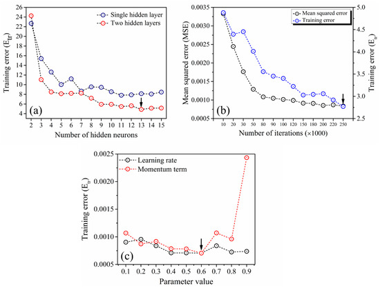 Initially, the ANN model was trained with single and double hidden layers by varying the hidden neurons from two to 15 in each layer. Figure 2a illustrates the change in Etr with hidden neurons in single as well as two hidden layers. From the figure, it is clear that the Etr values of total datasets are gradually decreasing with increasing hidden neurons. As compared with a single hidden layer, training with two hidden layers shows a significant decrease in error values. Within two hidden layers, the minimum error value of both MSE and Etr was noticed at 13 hidden neurons. Hence, the model with two hidden layers containing 13 hidden neurons was considered for further model training. On the other hand, the model was trained with a various number of iterations starting from 10,000 to 250,000. Variation in MSE and Etr as a function of iterations is illustrated in Figure 2b. Both error values were gradually decreased with increasing the number of iterations. Finally, the model with 250,000 iterations reveals the minimum error values, as indicated in Figure 2b. Further training involves the optimization of the model parameters, such as the momentum term (α) and the learning rate (η). Figure 2c shows the decreasing Etr with an increase in momentum term, whereas the higher values of learning rate results in noticeable increment in Etr due to the overtraining of the model. Finally, optimum values of the momentum term and learning rate preferred was 0.6.