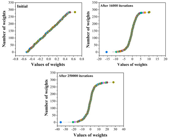 The sensitivity of the trained network with 13-13-4 architecture was improved by a sigmoid transfer or activation function. The transfer function is the main power for the neural networks, which helps to handle the non-linearities. The choice of transfer function strongly influences the complexity and performance of neural networks. Figure 3 represents the weights distribution and the behavior of the sigmoid transfer curve with the function of iterations. From the figure, it is clear that initially (at 0 iterations) the weights distributed linearly within values of −0.6 and 0.6. With an increasing number of iterations, from 0 to 16,000, the curve takes the S-shape with improved weight distribution from −15 to 15. Finally, with optimum iteration values (250,000), the weights were well distributed, ranging from −40 to 40. The well-distributed weights help to correlate the complex relationship between the inputs and output variables, which helps to attain reasonable predictions.