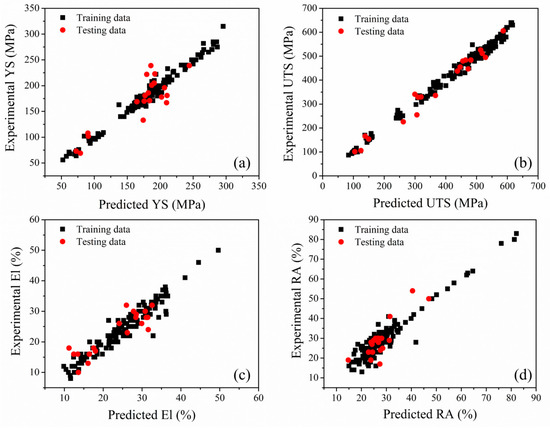 The ability of the neural network model to predict the mechanical properties of 25Cr-20Ni-0.4C steels: (a) YS, (b) UTS, (c) % El and (d) % RA of the training and test datasets.