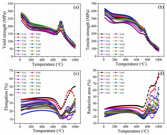 The usefulness of the developed model is not limited to only prediction of unseen test data. The experimental mechanical properties of the steels were available at service temperatures in the steps of 100 °C from room temperature to 1000 °C. Conducting experiments at a higher temperature is expensive. By performing a sensitivity analysis on the developed model [17,18], we simulated the effect of service temperature at minute intervals of temperature on mechanical properties. The estimated tensile properties of 25Cr-20Ni-0.4C steels (TAA–TAS) over a wide range, of 25 to 1000 °C, are illustrated in Figure 5. From the figure, it is noticed that with an increase in temperature from 25 to 1000 °C, the YS as well as UTS of all steels (TAA–TAS), gradually decreases, as shown in Figure 5a,b, respectively. Over 750 °C, the strength of the steels decreased, and the ductility was increased as expected (Figure 5c,d). This predicted phenomenon demonstrates a well-known behavior in engineering materials. Surprisingly, we observed the unexpected increment in YS and respective decrement in % El around the temperatures of 680 to 750 °C for all the steels. In this search space, the experimental data were available only at a temperature of 700 °C. The increase in strength happens at the expense of ductility. However, after thoroughly examining the published literature, we found that the predictions are in accord with the reports of L. Gardener [19] and J. A. Horak [20]. The simulated behavior maps the relationship between the output properties well in the entire predictive range, which is not supplied to the model. Hence, the model predictions revealed an excellent agreement with the practical point of view.