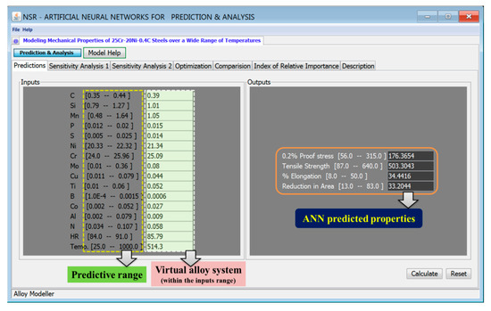 The screenshot of the ANN model shows the prediction of mechanical properties of a virtual 25Cr-20Ni-0.4C steel by using mean values of all input variables. Within the predictive range of the inputs, there are millions of combinations of experiments possible, of which the model can predict with reasonable accuracy.