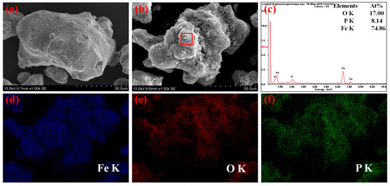 SEM images of the powders (a) pure iron powder, (b) phosphated iron powder, (c) EDS analysis of the selected area and EDS maps of (d) iron, (e) oxygen and (f) phosphorus of phosphated powders.