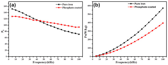 The effects of the phosphating process on the soft magnetic properties of the samples (a) the amplitude permeability and (b) the core loss.