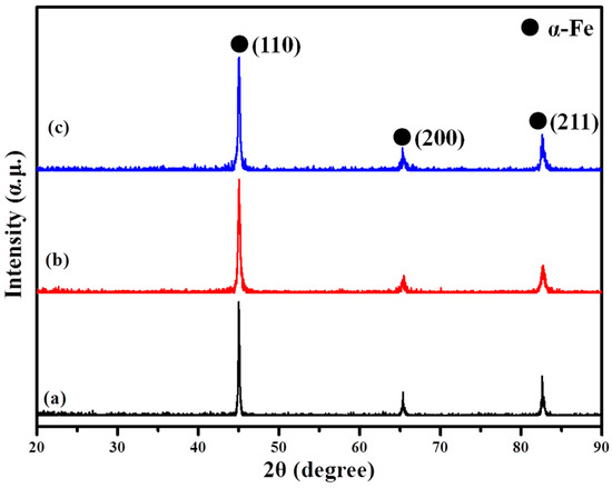 The XRD patterns of the powders (a) pure iron; (b) hybrid coating via the ball-milling method with 8% Al2O3; (c) hybrid coating via the sol–gel method with 8% Al2O3.