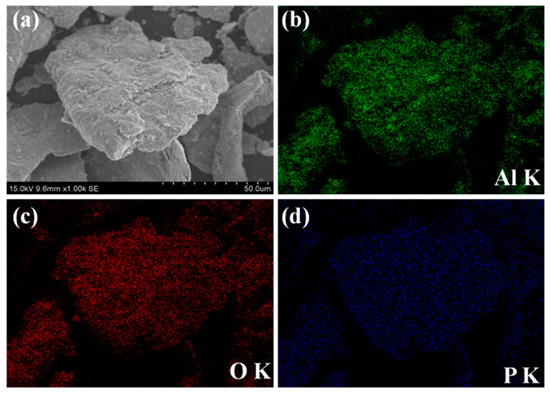 SEM images and EDS maps of the hybrid-coated powders via ball milling are exhibited in Figure 4. A change of the particle shape from the irregular shape to a flake shape after the ball-milling process could be observed in Figure 4a and Figure 2a. Traces of aluminum, oxygen and phosphorus are uniformly detected on the particle surface in the EDS maps (Figure 4b–d), suggesting the formation of the core–shell structured Fe @ phosphate @ Al2O3 SMCs.