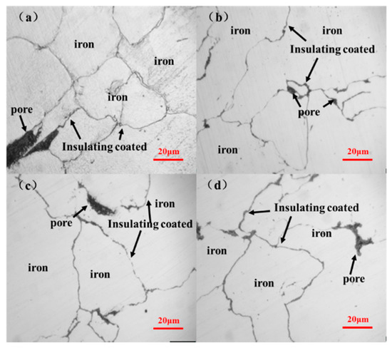 Figure 5a–d indicates that increasing the Al2O3 content results in thicker and more uniform insulating layers. No obvious insulating layers could be seen with the addition of 2% Al2O3. Insulating layers were evident with additional amounts of 6% Al2O3, but some parts of the matrix particles still contacted directly. Further increasing the additional amount of Al2O3 to 8% leads to complete insulating layers. However, more pores could be observed with the increasing Al2O3 content.