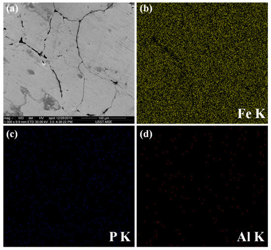 To further analyze the microstructure: the SEM (scanning electron microscopy) images of the polished surface of the Fe @ phosphate @ Al2O3 SMC compact were characterized. In addition, the EDS maps were shown to verify the microstructure (Figure 6). The iron matrix particles were firmly encapsulated by a thin coating with a core–shell structure via the ball-milling method. the fact that the P and Al elements only distributed around the matrix powder and the Fe element distributed in almost the whole visual area could strongly prove the nature of the composite interface microstructure.