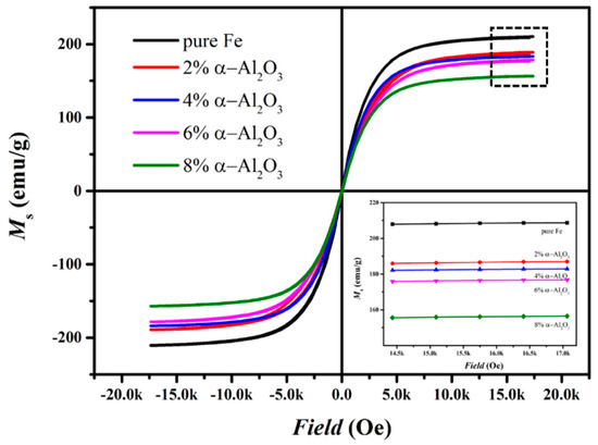 Figure 7 reveals the hysteresis loops of the matrix iron particles and the hybrid-coated particles prepared by the ball-milling method with the various additional amounts of Al2O3. The saturated magnetization of raw pure iron is approximately 205 emu/g. All the hybrid-coated powders display excellent properties of saturated magnetization of approximately 160 emu/g to 190 emu/g. It is widely accepted that the saturated magnetization mainly depends on the composition and the purity of the materials [1], and that introducing non-magnetic phosphate and α-Al2O3 would dilute the percentage of magnetic phases and reduce the Ms as a result. The decreasing trend of the saturated magnetization in Figure 7 is due to the increasing content of Al2O3 in insulating layers.