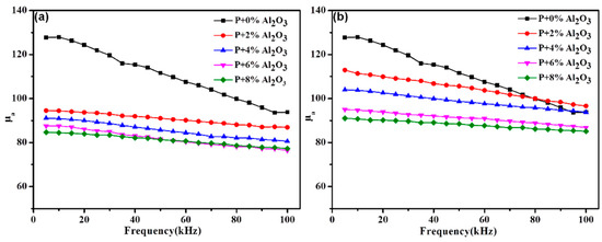 Figure 8 reveals the amplitude permeability as a function of frequency of the samples prepared by the ball-milling method (Figure 8a) and the sol–gel method (Figure 8b) with the same additional amount of Al2O3. The amplitude permeability of the hybrid-coated SMCs prepared by both methods exhibit excellent frequency stability at the measured frequency, which could be attributed to the better integrity of the insulation layers shown in Figure 5. Increasing the content of Al2O3 causes a tendency of permeability decrement, and the permeability of the samples with 8% Al2O3 reach 77.24 (ball milling method) and 85.14 (sol-gel method), respectively, at 100 kHz, which are ~82.4% and ~90% of that of phosphate-coated powders (93.7). The results could be explained by the following reasons. On the one hand, the permeability has a positive correlation with the Ms and the magnetism would be diluted by the non-magnetic Al2O3, as shown in Figure 6. On the other hand, a higher porosity with an increasing Al2O3 content could be concluded from Figure 5. The decreasing magnetic permeability is usually attributed to the inter-particle gap effect, as a source of the demagnetizing field [1]. As a result, the density of the SMCs reduces and results in the decreasing of the permeability.