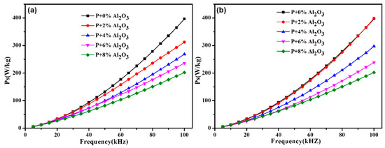 Figure 9 depicts the influence of the Al2O3 content on the total core loss of the SMCs samples prepared by the different methods. It can be seen that the effect of the preparation methods on the total core loss is slight. Compared with the phosphate-coated samples, the total core loss of hybrid-coated samples decreases by ~49% (202.3 at 100 kHz by the sol–gel method) and ~47% (210.8 at 100 kHz by the ball-milling method) with 8% Al2O3. To further explore the effects of the Al2O3 content and the fabrication methods on the total core loss of SMCs samples, the total core loss curves were investigated by the loss separation method. The total core loss (Pt) at a weak field and a relatively low frequency could be separated and written as [4,23]: