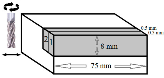 Cutting schematic for each experimental run showing length of cut = 2 × 75 mm2 (not to scale), axial depth of cut = 8 mm, and radial depth of cut = 0.5 mm. The numbers 1 and 2 show the order of the slice removal. The total volume (600 mm3) of material to be removed in each run is shaded gray.